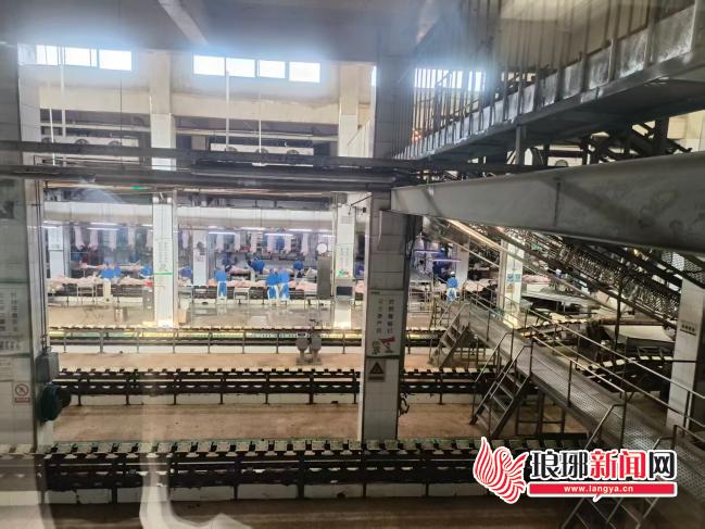 正在12条从动化出产线上对生猪进行查验、屠宰、